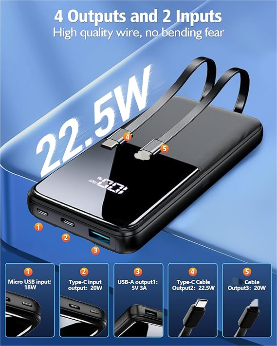 Three-in-One Charging Cables: Comes with USB-C, Lightning, and Micro-USB cables, making it compatible with almost any device. No need to carry extra cords or adapters.