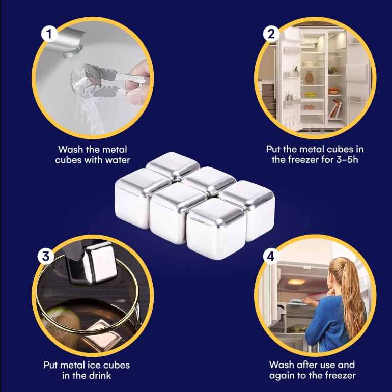 Reusable 6-Piece Steel Ice Cubes: Enjoy endless refreshment. The six reusable stainless steel ice cubes chill your drink without dilution keeping flavor intact. Eco-friendly, easy to clean, and made for years of use.